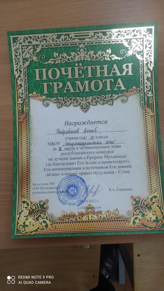 Ученик нашей школы принимал участие в конкурсе «Лучший из людей», посвященном дню рождения самого лучшего в мире из людей, Пророку Мухаммаду (с.|.с) и занял третье место, с чем мы его и поздравляем 👏🏻